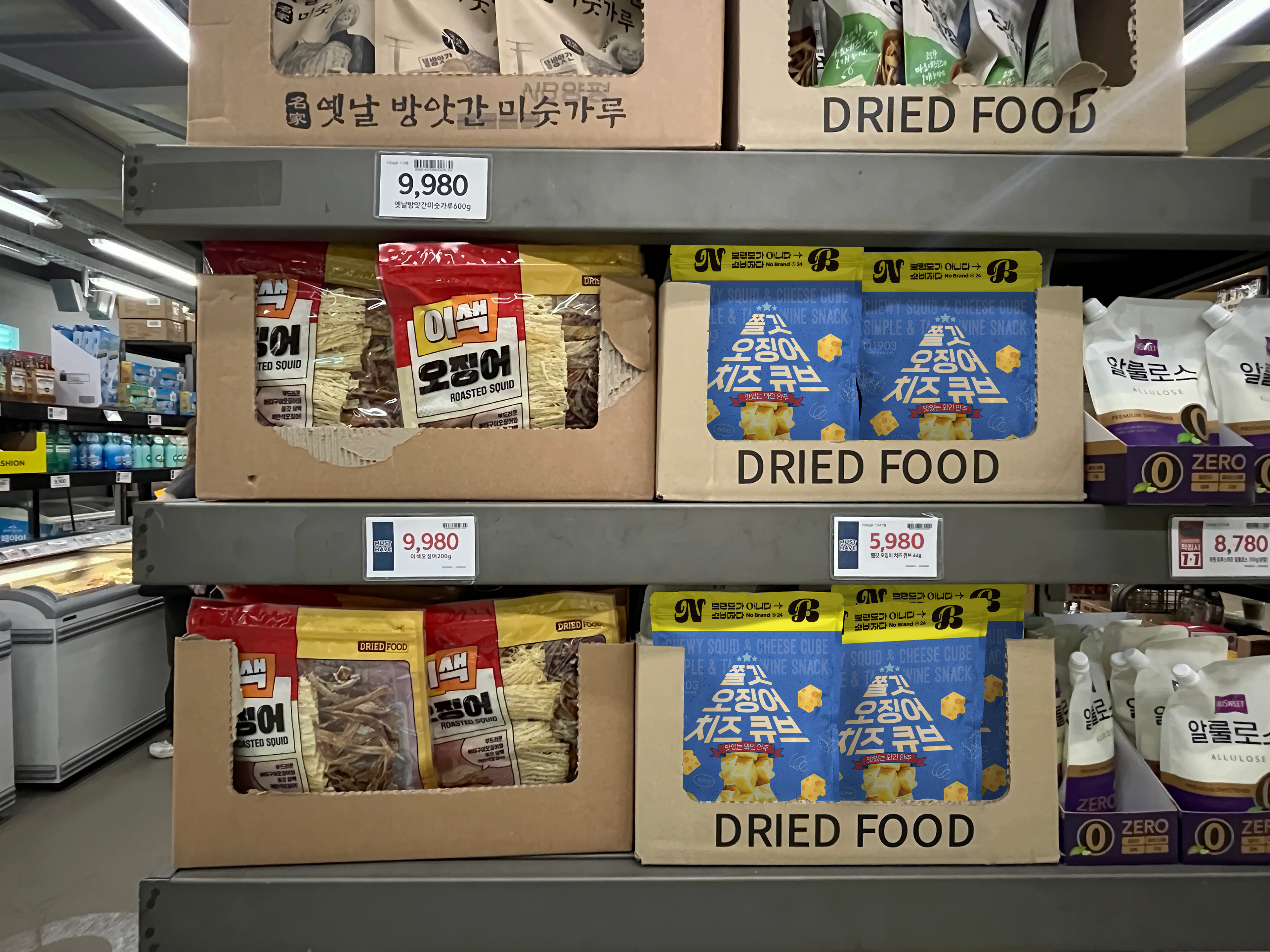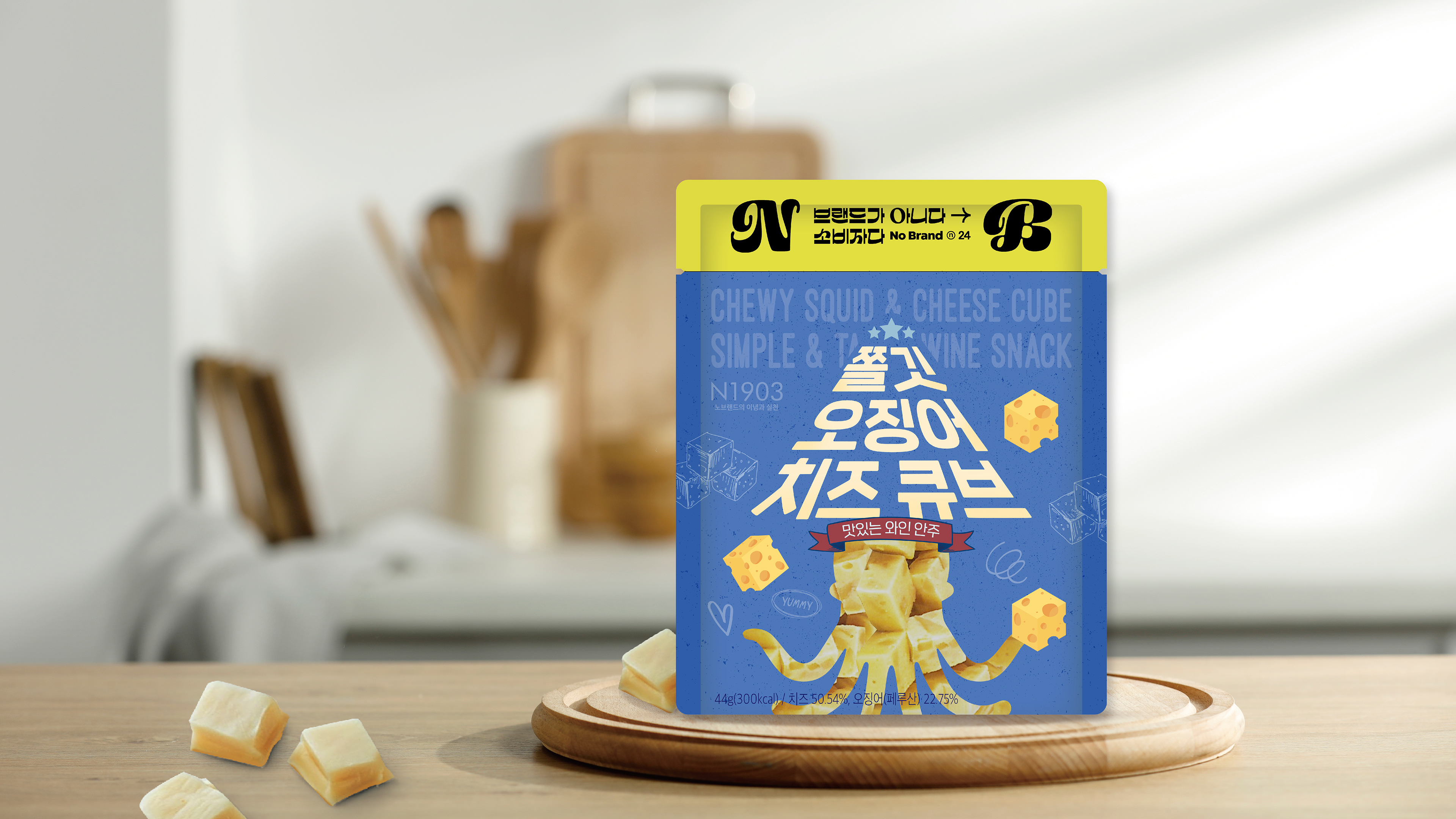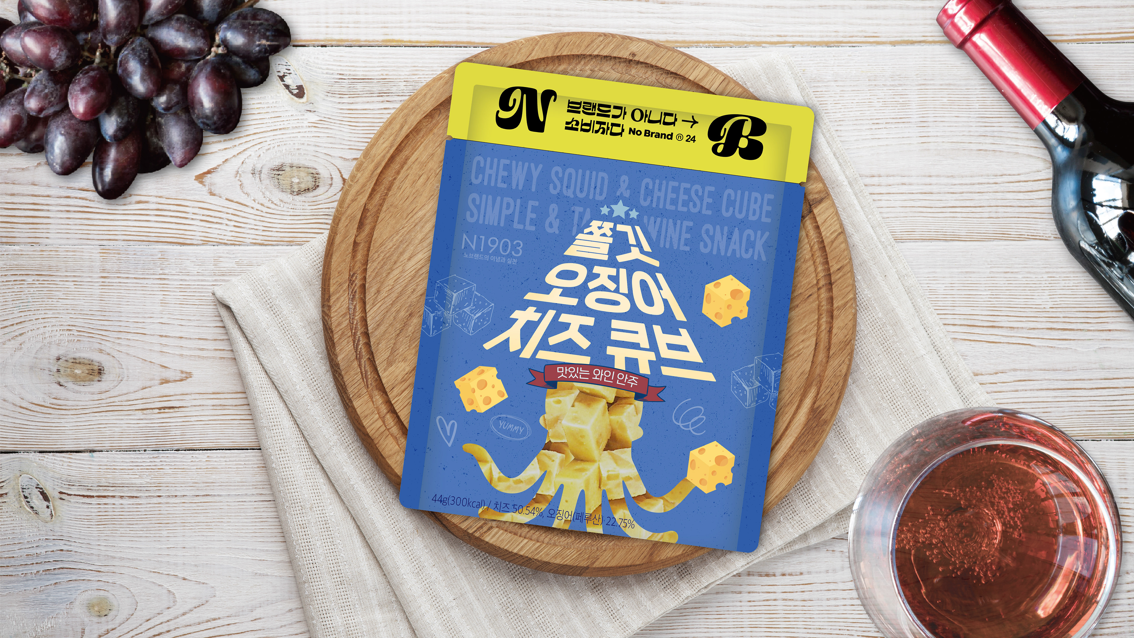 노브랜드 '쫄깃오징어치즈큐브'는 '와인과 함께 먹는 간식' 컨셉으로 배경에는 치즈와 화이트 라인 그래픽을 활용해 캐주얼한 분위기를 살렸으며, 상단에는 패키지 디자인 가이드라인에 맞춘 로고를 배치했습니다. 또한 오징어 형태의 타이포를 제작하고 몸통 부분에 투명창을 적용해 실제 제품이 보이도록 했습니다.